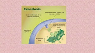 El documento describe los principales orgánulos del tráfico vesicular en células eucariotas, incluyendo el retículo endoplasmático, el complejo de Golgi, lisosomas, y las vías secretoras y endocíticas. Explica procesos como la fagocitosis, pinocitosis y exocitosis que involucran el transporte de materiales a través de vesículas y la fusión de membranas. También menciona las proteínas SNARE que permiten el transporte selectivo entre orgánulos.