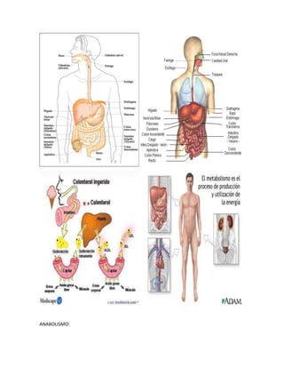 El metabolismo es el conjunto de reacciones bioquímicas y procesos físico-químicos que ocurren en una célula y en el organismo, y permiten las diversas actividades celulares. El anabolismo involucra la síntesis de moléculas orgánicas complejas a partir de precursores más sencillos, utilizando energía. El catabolismo consiste en la transformación de biomoléculas complejas en moléculas sencillas, almacenando la energía desprendida.