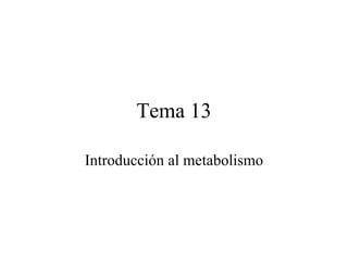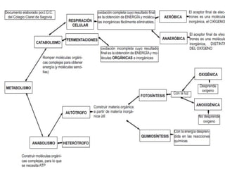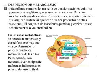 El documento proporciona una introducción al metabolismo. Explica que el metabolismo incluye transformaciones químicas y procesos energéticos en organismos vivos. Describe las rutas metabólicas que involucran enzimas y moléculas como metabolitos, transportadores de electrones y moléculas energéticas y ambientales. También clasifica los procesos metabólicos en anabólicos, catabólicos y anfibólicos, e introduce la clasificación de organismos según su nutrición y fuentes de carbono, hidrógeno,