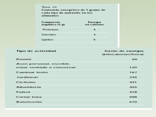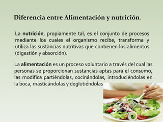 El documento resume la diferencia entre alimentación y nutrición, explicando que la nutrición son los procesos mediante los cuales el organismo recibe, transforma y utiliza las sustancias de los alimentos, mientras que la alimentación es el proceso voluntario de ingerir alimentos. También describe los componentes básicos de una dieta equilibrada y saludable, y las enfermedades que pueden resultar de una alimentación desequilibrada.