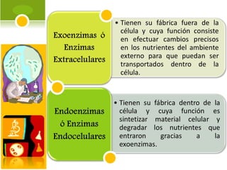 El documento describe los procesos metabólicos que ocurren en las células, incluyendo el metabolismo celular y las enzimas. Explica que las enzimas catalizan reacciones químicas y que existen dos tipos principales de enzimas. También describe factores que afectan la actividad enzimática y los tipos de inhibición enzimática.