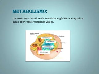 Este documento resume los conceptos clave de nutrición, digestión, respiración y metabolismo celular en plantas, animales y células. Explica que los seres vivos necesitan materiales orgánicos e inorgánicos para realizar funciones vitales, y describe los procesos de nutrición, digestión y respiración en plantas, animales y a nivel celular. También define la fotosíntesis y el metabolismo celular, incluyendo los procesos anabólicos, catabólicos, aeróbicos y anaerób