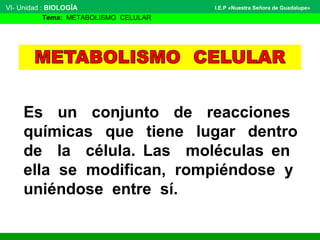 Este documento describe el metabolismo celular, incluyendo que es un conjunto de reacciones químicas que ocurren dentro de las células, cómo se clasifican en anabolismo y catabolismo, y cómo los organismos obtienen energía a través de la fotosíntesis o degradando moléculas orgánicas. También explica los roles del ATP y las enzimas en el metabolismo celular.