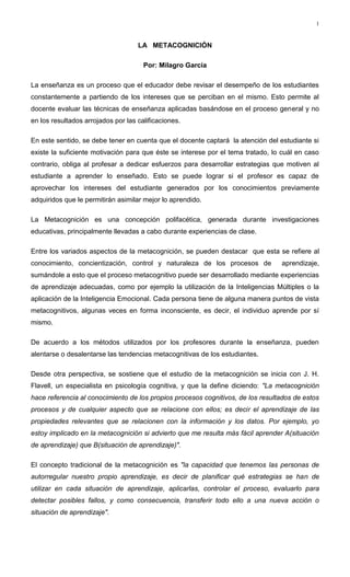 El documento describe la metacognición como la capacidad de pensar sobre nuestros propios procesos de pensamiento y aprendizaje. Explica que la metacognición involucra dos procesos: el conocimiento metacognitivo sobre nuestras habilidades cognitivas y estrategias de aprendizaje, y el control ejecutivo para regular y manipular estratégicamente estos procesos para lograr objetivos de aprendizaje. Además, señala que desarrollar habilidades metacognitivas puede mejorar el aprendizaje a través