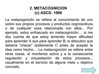 El documento describe la metacognición como el conocimiento que las personas tienen sobre sus propios procesos cognitivos y cómo usar ese conocimiento para controlar lo que están haciendo. La metacognición incluye dos aspectos principales: el conocimiento y control de sí mismo y el conocimiento y control del proceso de aprendizaje. Estos aspectos implican monitorear y controlar el compromiso, las actitudes y la atención, así como evaluar y planear los procesos cognitivos involucrados en aprender.