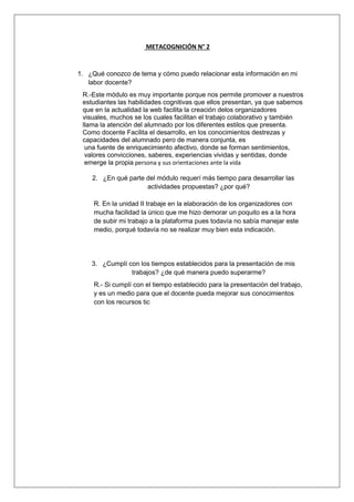 Este documento contiene 6 resúmenes de metacogniciones realizadas por un docente sobre su aprendizaje en el uso de herramientas TIC. En general, el docente encontró útiles estas herramientas para enriquecer su labor educativa y el aprendizaje de los estudiantes, aunque requirió tiempo para familiarizarse con algunas como Hangouts, Calaméo y entornos virtuales de aprendizaje.