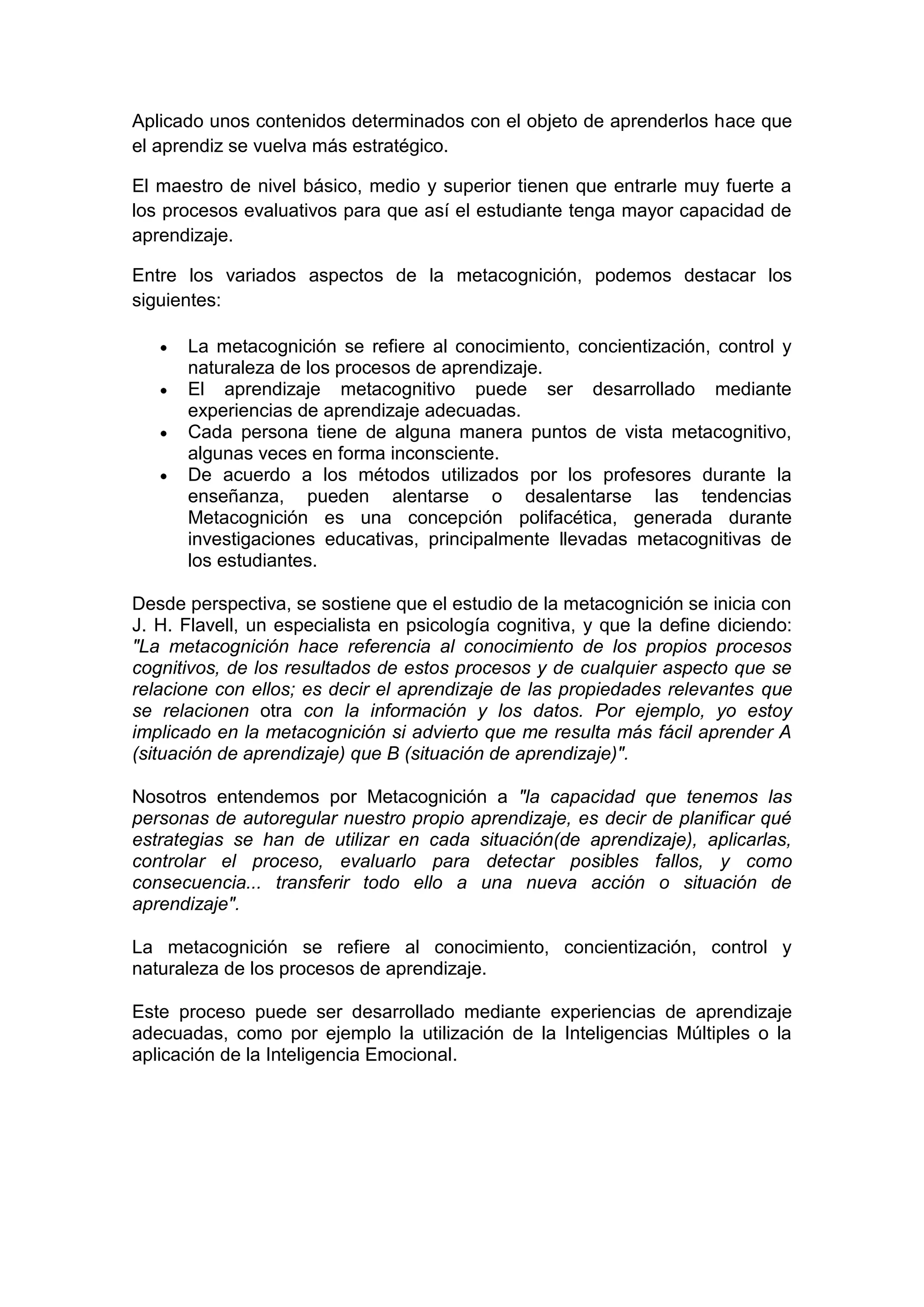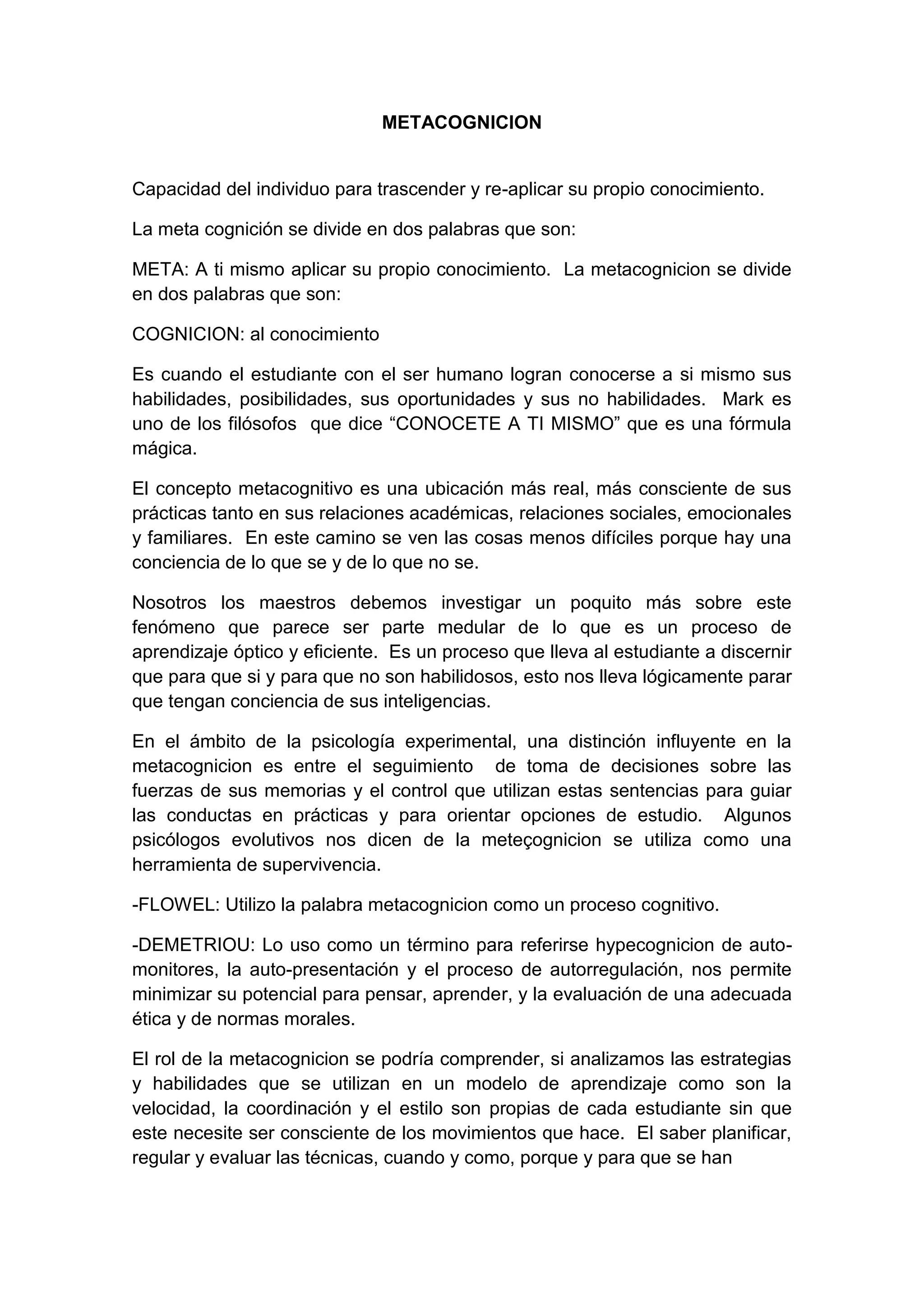 La metacognición se refiere a la capacidad de los individuos para aplicar y reaplicar su propio conocimiento. Implica el autoconocimiento de las habilidades, posibilidades y limitaciones propias. También incluye la capacidad de monitorear y regular procesos cognitivos como el aprendizaje. Desarrollar la metacognición permite a los estudiantes ser más estratégicos y eficientes en su aprendizaje.
