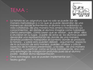 La metacognición permite planificar estrategias de aprendizaje, aplicarlas, controlar el proceso y evaluarlo para mejorar. La historia se puede enseñar de manera más efectiva si los estudiantes se involucran activamente imaginando escenarios históricos y debatiendo sobre ellos, en lugar de aprenderla de forma repetitiva. Estrategias como el teatro, programas de radio, entrevistas y líneas de tiempo pueden motivar a los estudiantes a expresar sus propias ideas y reflexionar críticamente. Es importante que los estudiantes eval