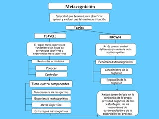 El documento habla sobre la metacognición, que es la capacidad de planificar, aplicar y evaluar una situación. Describe las teorías de Flavell y Brown sobre la metacognición y sus cuatro componentes. Explica que la metacognición es importante para el aprendizaje y que se desarrolla a través de la práctica guiada. Finalmente, menciona que la metacognición es una de las áreas más dinámicas de la psicología educacional.