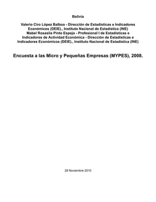 La Encuesta MYPES 2008 tuvo como objetivo determinar las características estructurales y de funcionamiento de las micro y pequeñas empresas en Bolivia. La encuesta recopiló información sobre el personal ocupado, remuneraciones, gastos, ingresos, activos fijos y transacciones financieras de empresas con menos de 15 empleados y ventas anuales menores a 3 millones de bolivianos. La encuesta cubrió las principales ciudades de los 9 departamentos de Bolivia y se centró en empresas de industria, comercio y servicios.