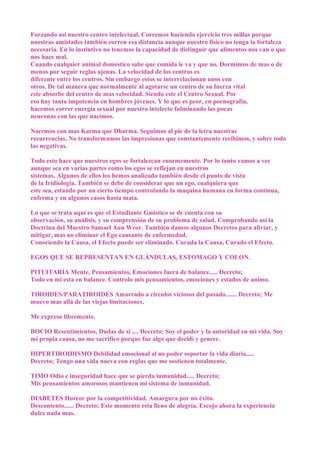 Este documento presenta una serie de decretos y afirmaciones para mejorar la salud física y mental a través de la metafísica práctica. Incluye decretos para la felicidad, la curación física mediante afirmaciones, y cómo diferentes egos se representan en órganos como el estómago y el intestino. También incluye oraciones de transmutación y afirmaciones para elevar los pensamientos y sentimientos. El objetivo general es utilizar la mente y las palabras para mejorar el bienestar a través de la energía positiva.