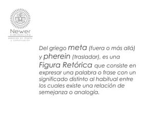 Este documento explica el concepto de metáfora y proporciona varios tipos y ejemplos de metáforas. Una metáfora es una figura retórica que consiste en expresar una palabra o frase con un significado distinto al habitual mediante una relación de semejanza o analogía. El documento describe 16 tipos diferentes de metáforas e incluye ejemplos poéticos y ejercicios para identificar metáforas.