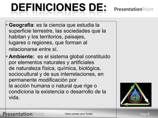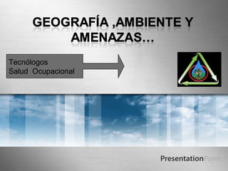 El documento habla sobre la geografía, el ambiente y las amenazas. Define la geografía como el estudio de la superficie terrestre y las sociedades que la habitan. Define el ambiente como el sistema global constituido por elementos naturales y artificiales. Explica que una amenaza es la probabilidad de que ocurra un evento considerando su tipo y ubicación, pudiendo ser de origen técnico, social o natural. Luego enumera posibles respuestas comunitarias frente a amenazas como estudios retrospectivos, capacitación y organización de evacuaciones y
