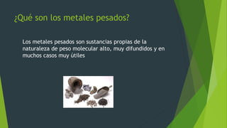 El documento describe los metales pesados más comunes, sus usos e implicaciones para la salud y el ambiente. Explica que el mercurio, plomo, cadmio, cobre y níquel pueden ser dañinos para la salud si se ingieren en altas cantidades. También analiza cómo los residuos industriales y desechos electrónicos que contienen estos metales contaminan el ambiente. Finalmente, ofrece sugerencias para prevenir la contaminación por metales pesados como educar a los demás, identificar fuentes de exposición y reducir el uso de