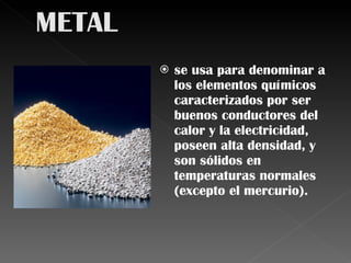 Los metales son elementos químicos que conducen bien el calor y la electricidad, son densos y sólidos a temperatura ambiente (excepto el mercurio), y se encuentran de forma natural en la corteza terrestre, generalmente mezclados con otras sustancias. Algunos de los metales más comunes son el hierro, el cobre, el aluminio, los metales preciosos como el oro y la plata, y el zinc. Los metales se extraen de los minerales mediante procesos como la fundición, tostado, lixiviación o electró