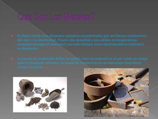 Los metales se caracterizan por ser buenos conductores del calor y la electricidad. Se obtienen de minerales en yacimientos y requieren procesos físicos para separar los materiales útiles de los no utilizables. Las edades de cobre y bronce marcan el desarrollo de la metalurgia de estos metales a través de aleaciones, mientras que la edad de hierro trajo el uso del hierro para herramientas. Los metales tienen propiedades como alta densidad, estado sólido y buena conductividad térmica y eléctrica