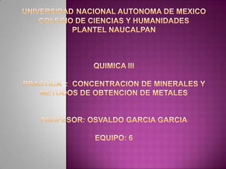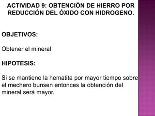 El documento describe un experimento para obtener hierro metálico a partir de la reducción del óxido de hierro (hematita) con hidrógeno gaseoso. Se coloca la hematita en un tubo de reacción y se hace pasar hidrógeno producido por la reacción de zinc y ácido clorhídrico. La hematita cambia de color más oscuro cuando se calienta, indicando la reducción parcial del óxido a hierro metálico y agua.