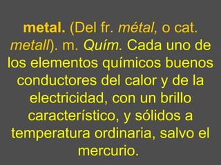 Este documento describe las propiedades y usos de los metales en la construcción. Explica que los metales se dividen en ferrosos y no ferrosos, y proporciona ejemplos de cada tipo y sus aplicaciones comunes. También destaca la importancia de que los arquitectos comprendan los procesos tecnológicos involucrados en el uso de metales para la construcción, como la fabricación, unión de piezas y mantenimiento, a fin de diseñar estructuras metálicas de manera responsable.