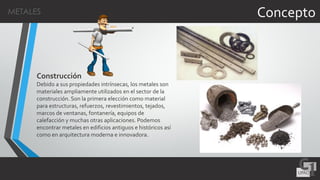 Este documento trata sobre los metales y sus aplicaciones en la construcción. Explica que los metales son materiales ampliamente utilizados debido a sus propiedades como resistencia mecánica y conductividad térmica. Describe los procesos de extracción de metales de minerales y las características de diferentes tipos de metales como el hierro, aluminio y cobre. También detalla usos comunes de metales como refuerzos de concreto, estructuras y revestimientos.