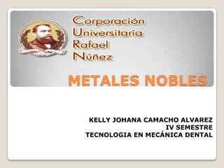 Este documento describe los metales nobles como el oro, platino y paladio que son resistentes a la corrosión. Explica que las aleaciones se usan para mejorar las propiedades de los metales y que el oro se alea comúnmente para aumentar su dureza. También proporciona detalles sobre las propiedades del oro, paladio, platino, plata y mercurio.
