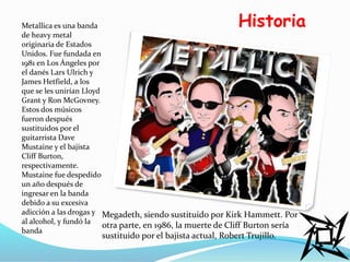 Metallica es una banda de heavy metal estadounidense fundada en 1981 en Los Ángeles por el danés Lars Ulrich y el estadounidense James Hetfield. La banda ha tenido varios cambios de integrantes a lo largo de los años, incluyendo la sustitución del guitarrista Dave Mustaine y el bajista Cliff Burton, así como la adición actual de Kirk Hammett a la guitarra y Robert Trujillo al bajo.
