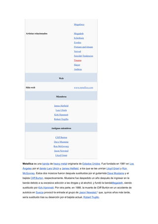 Este documento proporciona información sobre la banda de heavy metal Metallica. Fue fundada en 1981 en Los Ángeles por Lars Ulrich y James Hetfield. Han tenido varios cambios de alineación a lo largo de los años, pero actualmente están compuestos por James Hetfield, Lars Ulrich, Kirk Hammett y Robert Trujillo. Metallica es considerada una de las bandas más importantes e influyentes de thrash metal y heavy metal, habiendo vendido más de 100 millones de discos a nivel mundial.