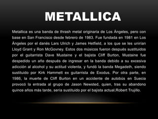 Metallica es una banda de thrash metal originaria de Los Ángeles fundada en 1981 por Lars Ulrich y James Hetfield. La banda ha tenido varios cambios de integrantes y ha lanzado 10 álbumes de estudio que incluyen éxitos como Ride the Lightning, Master of Puppets y el popular álbum homónimo conocido como "The Black Album".