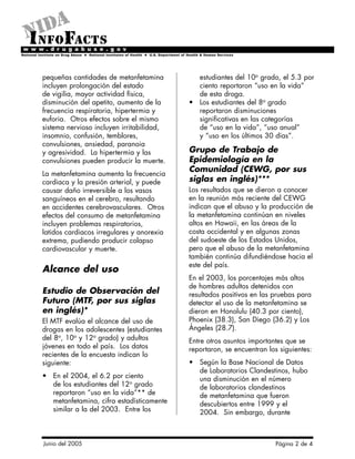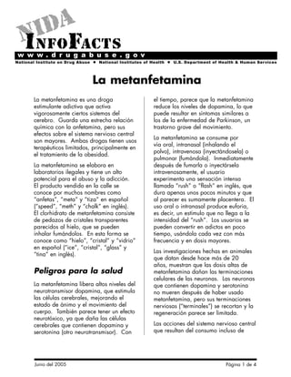 La metanfetamina es una droga estimulante altamente adictiva que daña las células cerebrales. Se consume de varias formas, incluyendo fumarlo e inyectarlo, lo que puede causar una sensación intensa de placer pero también dependencia rápida, daño cerebral, convulsiones e incluso la muerte. Mientras su uso ha disminuido entre adolescentes, sigue siendo un problema grave en algunas áreas del oeste y suroeste de Estados Unidos y se está propagando a otras regiones.