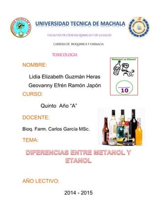 Este documento compara las propiedades físicas y químicas del metanol y el etanol, destacando que aunque se ven iguales, el metanol es extremadamente tóxico incluso en pequeñas dosis mientras que el etanol es seguro en cantidades moderadas. Incluye tablas comparativas de sus puntos de ebullición, solubilidad, densidad, y otras propiedades, así como ejemplos de reacciones como la oxidación y deshidratación para diferenciarlos.