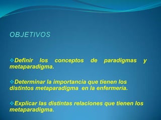 Este documento define los conceptos de paradigma y metaparadigma, los cuales son fundamentales en la enfermería. Explica que el metaparadigma de enfermería está compuesto por cuatro conceptos clave: persona, entorno, cuidado y salud. Aunque existen debates sobre estos conceptos, comúnmente se adoptan los definidos por Virginia Henderson para la enseñanza de enfermería.