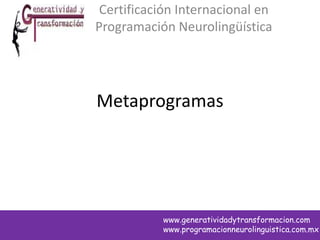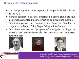 Este documento describe los metaprogramas en PNL. Explica que los metaprogramas son filtros mentales inconscientes que guían el procesamiento de información y toma de decisiones. También cubre varios tipos de metaprogramas como filtros de dirección, procesamiento del tiempo, razón y evaluación. El propósito de los metaprogramas es entender cómo funcionan las estructuras mentales para predecir comportamientos, no encasillar personas.