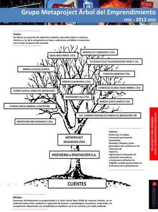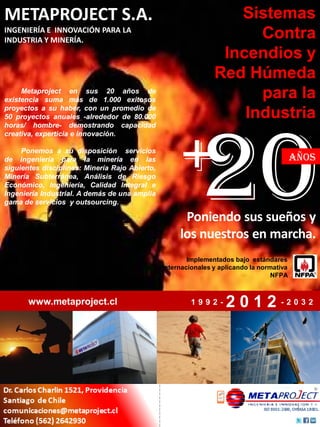 Metaproject es una empresa de ingeniería e innovación con más de 20 años de experiencia y más de 1.000 proyectos exitosos. Ofrece servicios de ingeniería para la minería, incluyendo minería a cielo abierto, subterránea, análisis de riesgo y calidad. También ofrece sistemas contra incendios y redes húmedas para la industria.