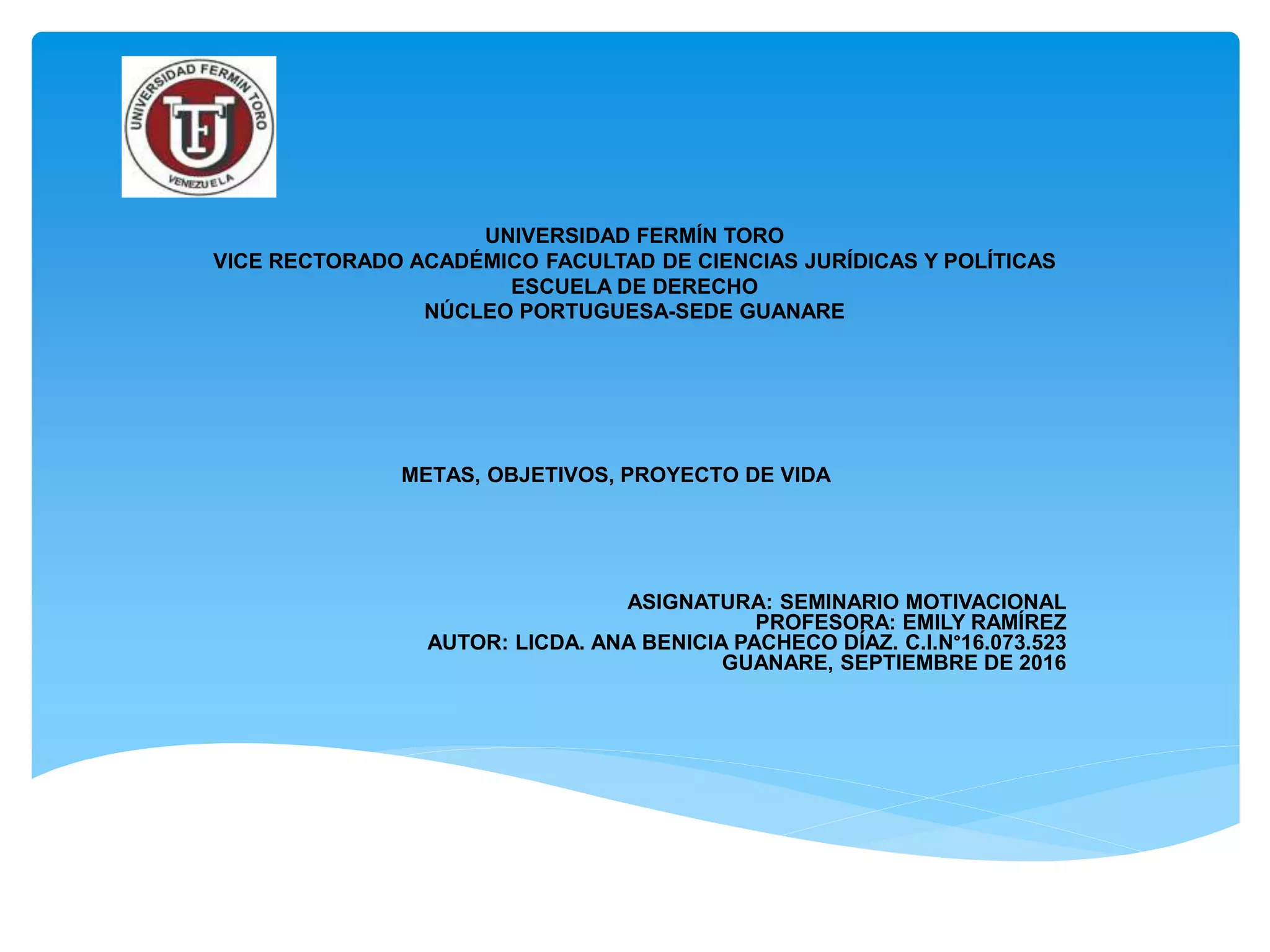 El documento define las metas como objetivos concretos que se logran paso a paso para alcanzar un objetivo mayor a largo plazo. Explica las diferencias entre metas y objetivos, y proporciona un ejemplo de cómo las metas se suman para completar un objetivo final. Luego, presenta un modelo de proyecto de vida que incluye visión, misión, principios, metas y objetivos personales, académicos y sociales junto con las actividades, personas involucradas, posibles inconvenientes y tiempo estimado para lograr cada uno.