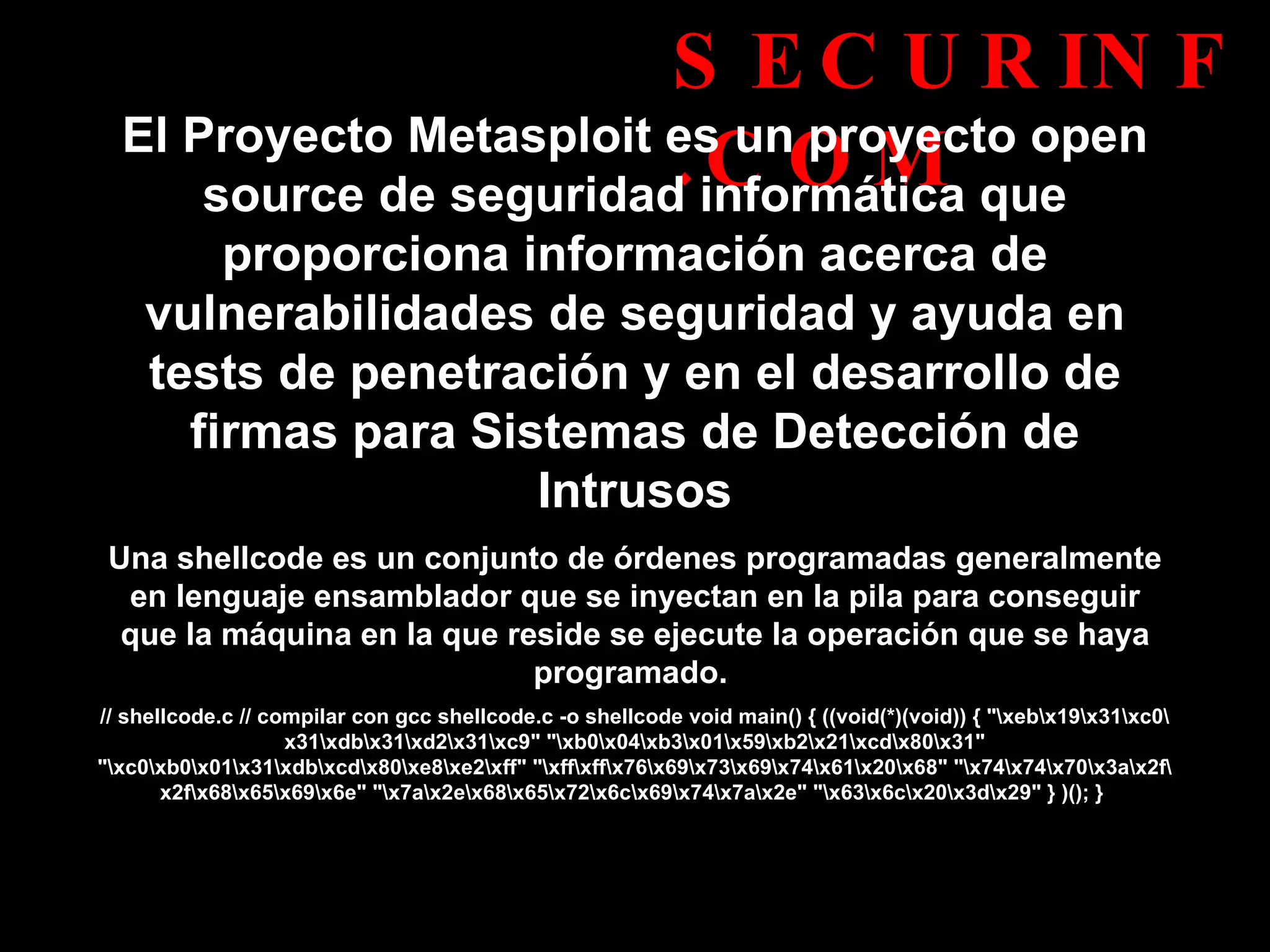 El documento habla sobre el uso de Metasploit, un proyecto de código abierto para pruebas de penetración. Explica brevemente lo que son las shellcodes y fragmentos de código para explotar vulnerabilidades, así como comandos básicos de Metasploit como mostrar módulos, cargar payloads y establecer parámetros de ataque como la dirección IP remota y el puerto.
