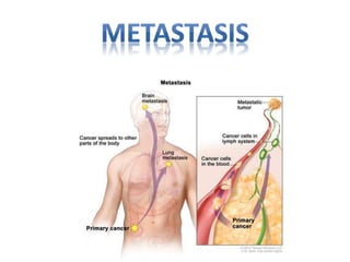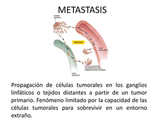 La metástasis implica la propagación de células tumorales desde un tumor primario a ganglios linfáticos u otros tejidos distantes. Las células tumorales deben infiltrar la matriz extracelular adheriéndose a sus componentes y secretando enzimas que la degradan para emigrar, luego pueden formar émbolos que se diseminan por los vasos sanguíneos y linfáticos hasta asentarse en nuevos órganos. Las mutaciones en el gen del retinoblastoma favorecen la proliferación celular incontrolada al impedir
