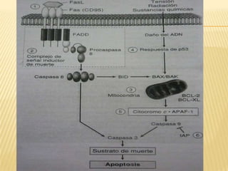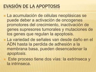 Este documento resume los principales mecanismos de desregulación del cáncer, incluyendo la evasión de la apoptosis, la angiogénesis, la invasión y metástasis, los cambios cromosómicos y epigenéticos, y el papel de los microRNAs. Describe cómo las mutaciones en oncogenes y genes supresores de tumores conducen al crecimiento anormal de células y cómo los tumores utilizan varios procesos para propagarse en el cuerpo.