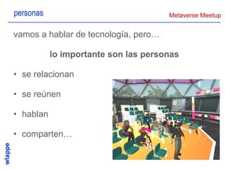 El documento habla sobre las posibilidades que ofrecen los mundos virtuales para realizar reuniones de forma remota. Menciona algunas herramientas y plataformas que permiten la interacción en entornos virtuales como Second Life y OpenSim, así como tendencias tecnológicas, sociales y de los usuarios que impulsan el uso de estas tecnologías. Finalmente plantea la pregunta de cómo debería ser el futuro de los mundos virtuales que estamos creando.