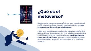 El metaverso se refiere a un mundo virtual interactivo, inmersivo y colaborativo, conceptualizado por primera vez por Neal Stephenson en 1992. Este espacio digital debe ser persistente, tener corporeidad y permitir la interacción entre usuarios. Ejemplos de su aplicación incluyen el ámbito de negocios, educación, arte y ocio, y su implementación requerirá una conectividad robusta y equipos compatibles.