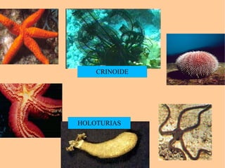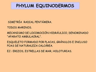 El documento presenta una clasificación taxonómica de los reinos, phylums y clases que componen el reino Metazoos. Describe las principales características de los phylums Poríferos, Cnidarios, Platelmintos, Nematodos, Anélidos, Moluscos, Artrópodos, Equinodermos y Cordados.