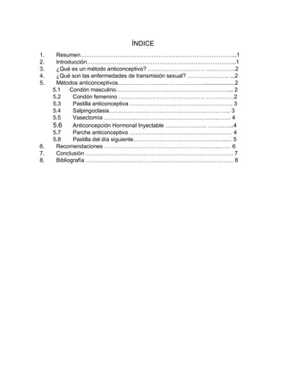 Se define brevemente qué son los métodos anticonceptivos y las enfermedades de transmisión sexual. Luego, se describe 8 métodos anticonceptivos comunes con su efectividad y si protegen contra enfermedades. Finalmente, se dan recomendaciones sobre el uso adecuado de los métodos.