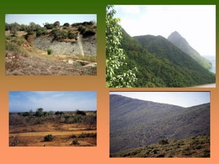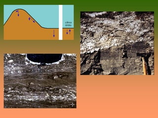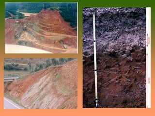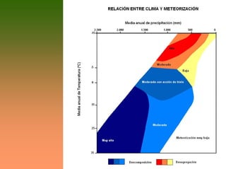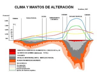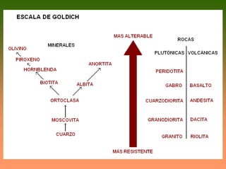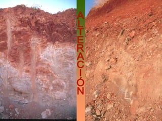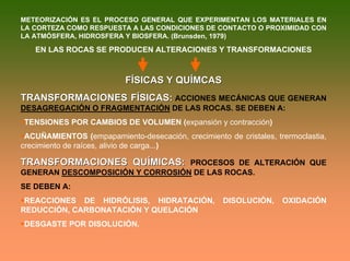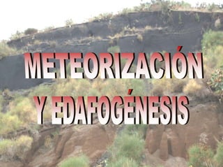 Este documento describe los procesos de meteorización que experimentan las rocas en la corteza terrestre debido a la interacción con la atmósfera, hidrosfera y biosfera. Se explican los procesos físicos y químicos de meteorización, incluyendo la desintegración, alteración mineralógica, formación de arcillas y disolución de minerales. También se detallan los factores que controlan la meteorización como la litología, el clima y la estructura geológica.