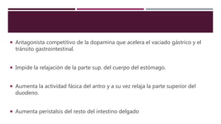 Este documento resume las propiedades y uso de la metoclopramida. Actúa como antagonista de la dopamina para acelerar el vaciado gástrico y tránsito intestinal. Se usa para tratar trastornos de la motilidad gastrointestinal, náuseas y vómitos inducidos por quimioterapia, y hipo. Puede causar efectos secundarios como somnolencia, inquietud y náuseas.