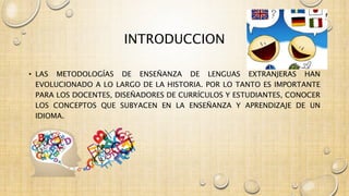 El documento aborda el método audio lingual en la enseñanza de lenguas extranjeras, destacando su enfoque en el desarrollo de habilidades orales a través de la imitación y el uso de materiales auditivos. Se enumeran ventajas como la fluidez del aprendiz y desventajas como la falta de énfasis en la gramática. Concluye que este método es efectivo para la adquisición rápida y espontánea de un nuevo idioma en contextos situacionales.