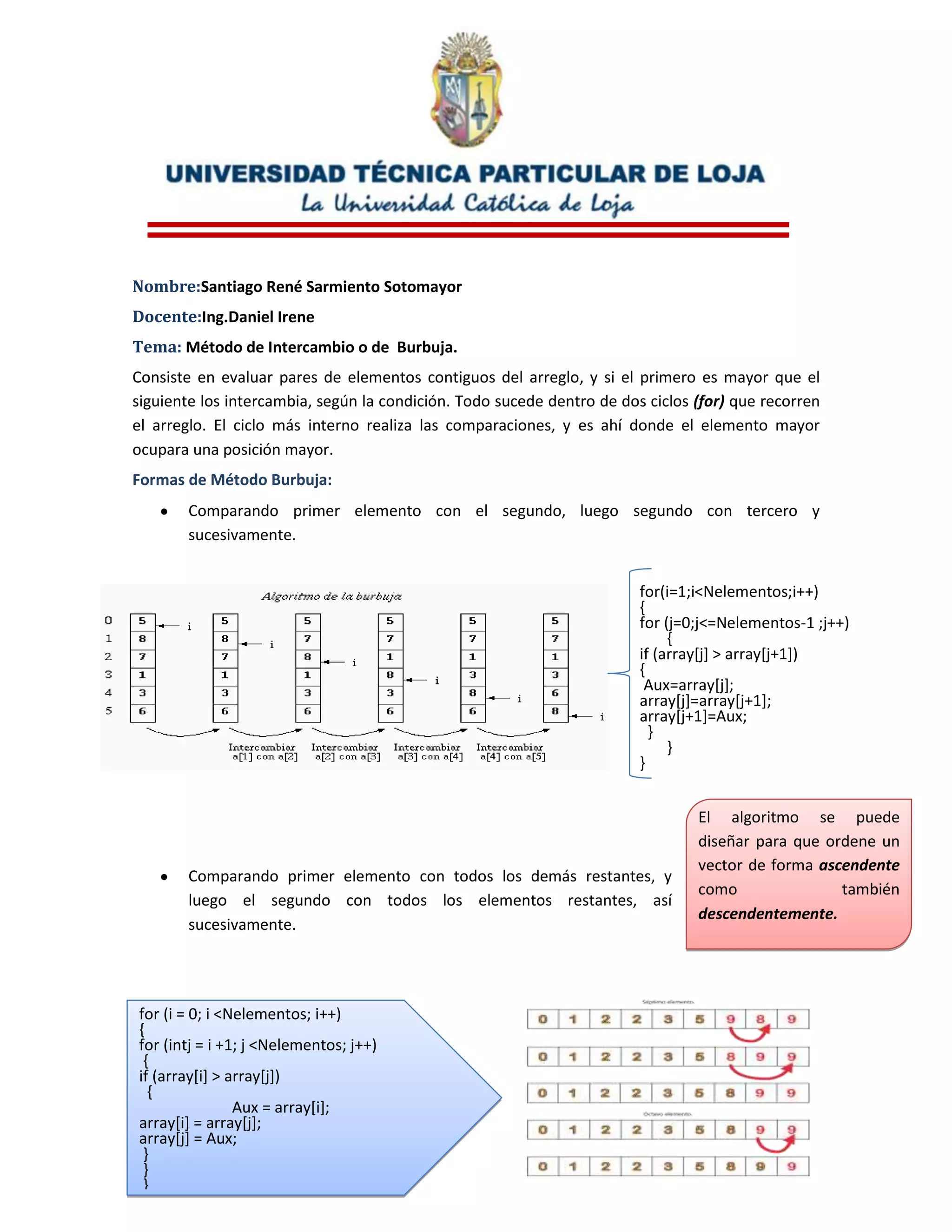 El documento explica el método de ordenamiento de burbuja, el cual ordena un arreglo comparando pares de elementos contiguos y intercambiándolos si están en orden incorrecto. Primero compara el primer elemento con el segundo, luego el segundo con el tercero, y así sucesivamente hasta ordenar completamente el arreglo. Incluye pseudocódigo del algoritmo y un ejemplo de cómo usarlo para ordenar un arreglo creado aleatoriamente.