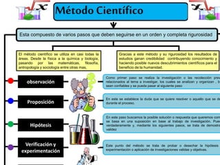 El método científico sigue varios pasos en orden riguroso: observación, proposición de una hipótesis basada en investigaciones previas, y verificación experimental de la hipótesis. Este método se utiliza en la mayoría de las áreas académicas y ha permitido nuevos descubrimientos que benefician a la humanidad gracias a la credibilidad que ganan los estudios realizados con rigor científico.
