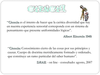 Este documento presenta información sobre la ciencia y el método científico. Define la ciencia como el intento de hacer que la diversidad de la experiencia sensorial corresponda con un sistema de pensamiento lógico y ordenado. Explica que el método científico implica observación, formulación de hipótesis, experimentación y conclusiones para establecer conocimiento verificable sobre el mundo.