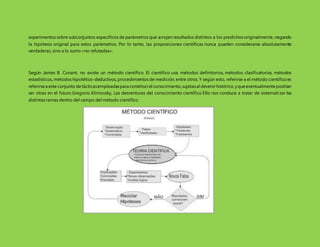 El método científico se basa en la observación sistemática, medición, experimentación y modificación de hipótesis. Se sustenta en dos pilares: la reproducibilidad, que permite que cualquier persona repita un experimento, y la refutabilidad, que establece que las proposiciones científicas pueden ser falsadas mediante experimentos. El método científico no considera que existan verdades absolutas.