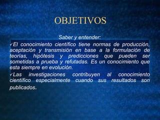 El documento describe el método científico y algunos conceptos clave de las ciencias. Explica que el método científico implica la formulación de teorías, hipótesis y predicciones que pueden ser probadas mediante experimentos. También describe las diferentes ramas de la ciencia y el proceso general de investigación científica, el cual involucra la observación de un fenómeno, la formulación de preguntas y una hipótesis, y la realización de experimentos para probar la hipótesis.