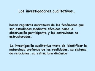 La investigación cualitativa se basa en técnicas como la observación participante y las entrevistas no estructuradas para estudiar fenómenos en un escenario natural de manera exploratoria, inductiva y descriptiva. Los métodos cualitativos como la observación, entrevista y participación permiten una amplitud de criterios a lo largo del proceso de investigación. La investigación cualitativa se enfoca en comprender la perspectiva de los participantes y el contexto de los eventos más que en generalizar resultados.