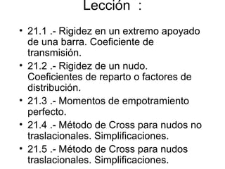 Este documento presenta el método de Cross para analizar nudos rígidos en estructuras. Explica los conceptos clave como nudos no traslacionales, momentos de empotramiento perfecto y reparto de momentos entre barras basado en sus rigideces relativas. También incluye ejemplos numéricos para ilustrar los cálculos de momentos aplicados a cada barra.